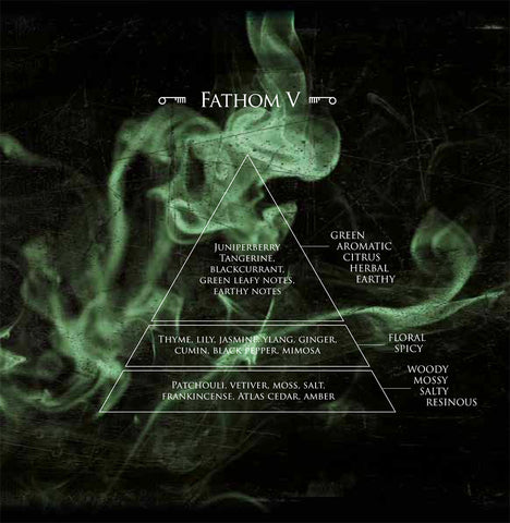 A challenging aquatic "fougere" fragrance, Fathom V is intensely green yet dark, counterposing top notes of rich mosses with aromatic herbals and the sparkle of juniper and tangerine. Floral undertones of thyme, lily, jasmine and ylang ylang blend with spicy ginger, cumin and black pepper to form the heart notes, while the composition rests on an intense base of woods, patchouli, vetiver, salt, incense and Atlas cedar.