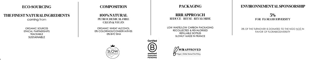 A re-enchanted experience. Bold, singular, sincere. The perfumes, created by Delphine Thierry of Inspiration Libre, are based on the beautiful Robertet natural raw materials. Karine describes: "The choice of raw materials is both artistic and ethical. We wanted perfumes that grow in the earth to provide perfume plants and growers with a prospect." **